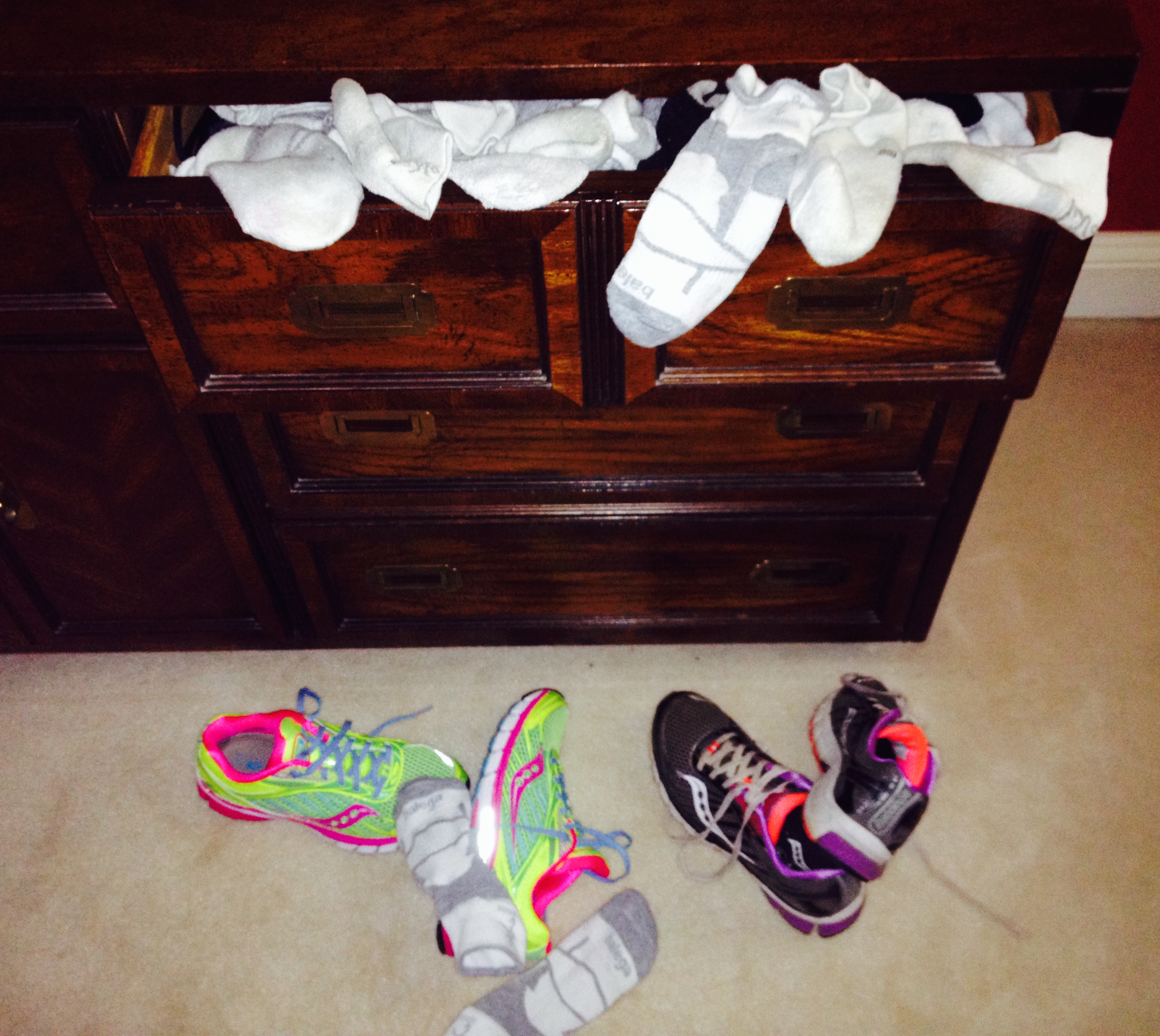 I have accumulated a lot of socks since I started running. In one year, I ran 24 races so that was 24 new pairs of Balega socks. To help me match them up after they come out of the wash, I started to put a code for each race on the toe of each sock with an indelible marker, such as “HH” for Historic Half, and “MCM” for the Marine Corps Marathon. The Dopey Challenge, which consists of a 5K, 10K, half marathon, and full marathon, made the sock marking more difficult so I just resorted to A, B, C and D to distinguish each race’s socks. Unfortunately, the marks don’t last and over time get blurry. I have a couple different styles of Balega socks, which helps with the matching process. Despite marking them and buying different styles, I am fairly confident that I frequently wear mismatched socks.