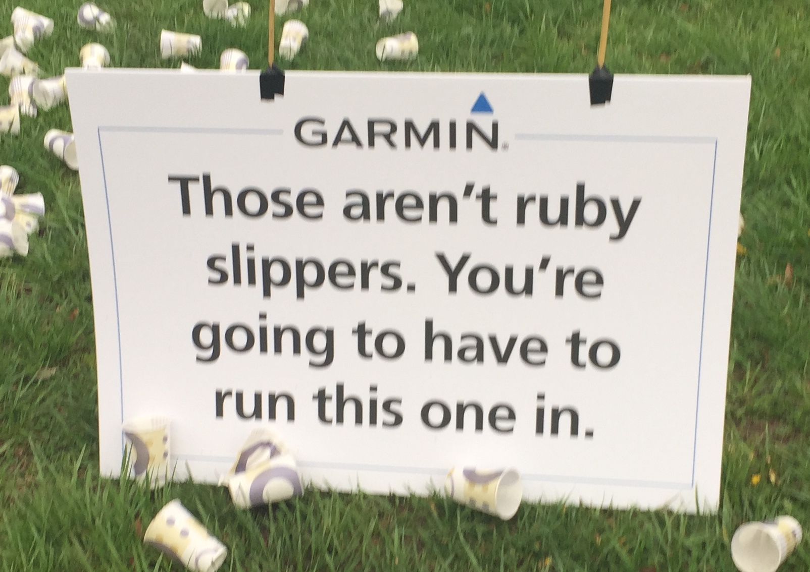There wasn’t much in the way of course entertainment but that didn’t really bother me. Garmin had lots of funny signs along the course that kept me amused. I found myself stopping to take pictures of them to share with you. As a result, my time suffered. I probably could have finished 10-15 minutes sooner if I had just focused on running.