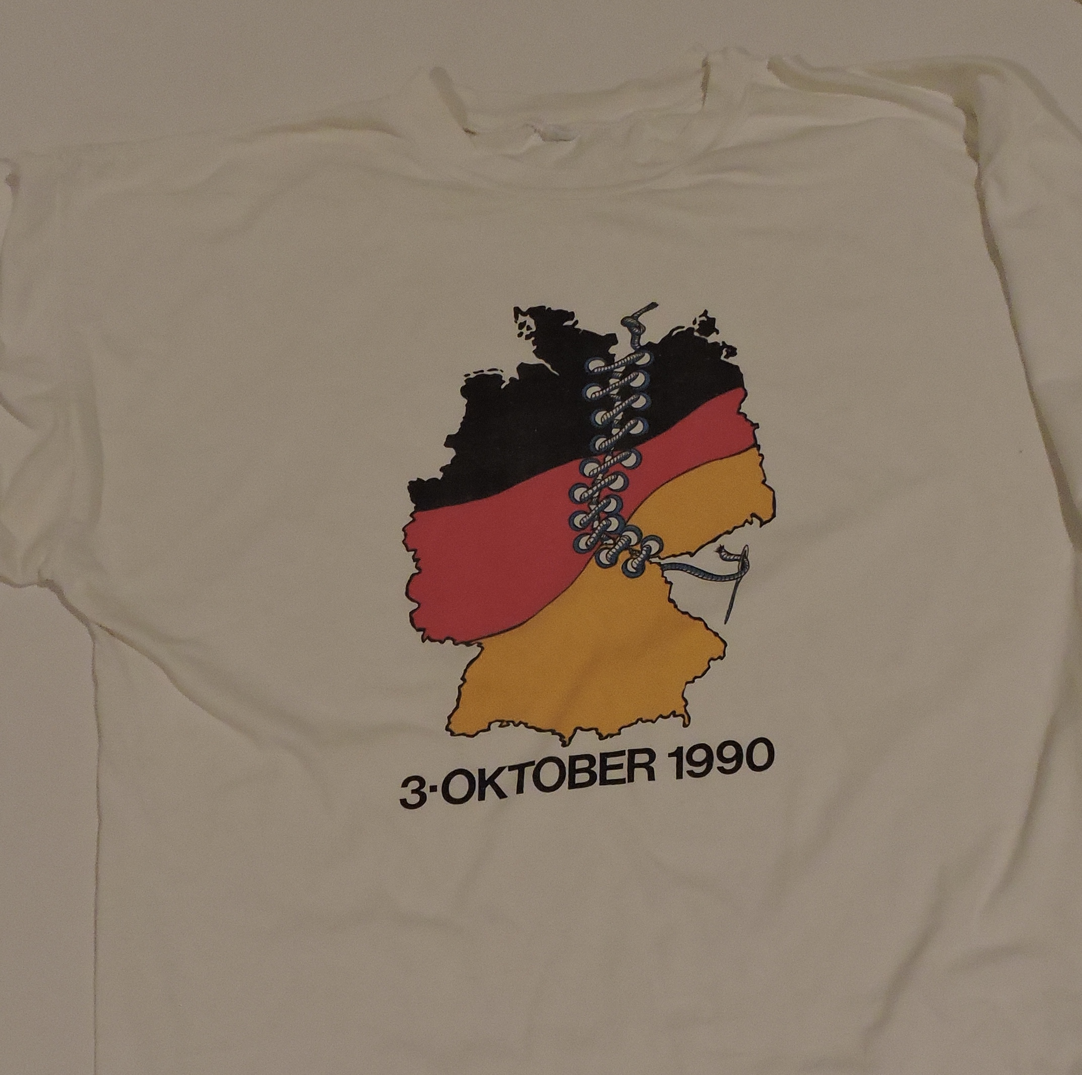 There was a huge celebration at the Reichstag building the night of October 2, 1990. It was like Times Square in New York City on New Year’s Eve with everyone waiting for the ball to drop at midnight. It was the eve of Unity Day, October 3. There were hundreds of thousands of people there that night. The atmosphere was electric with flags, fireworks, and people cheering. My husband ended up climbing a tree to get a better view of the ceremony. Unity Day was a national holiday. Throughout Berlin there were street festivals with all sorts of entertainment – bag pipers in kilts, traditional German bands, country western bands, and rock and roll bands – and booths selling food, beer, champagne, and Unity Day souvenirs. We bought t-shirts to commemorate the reunification.