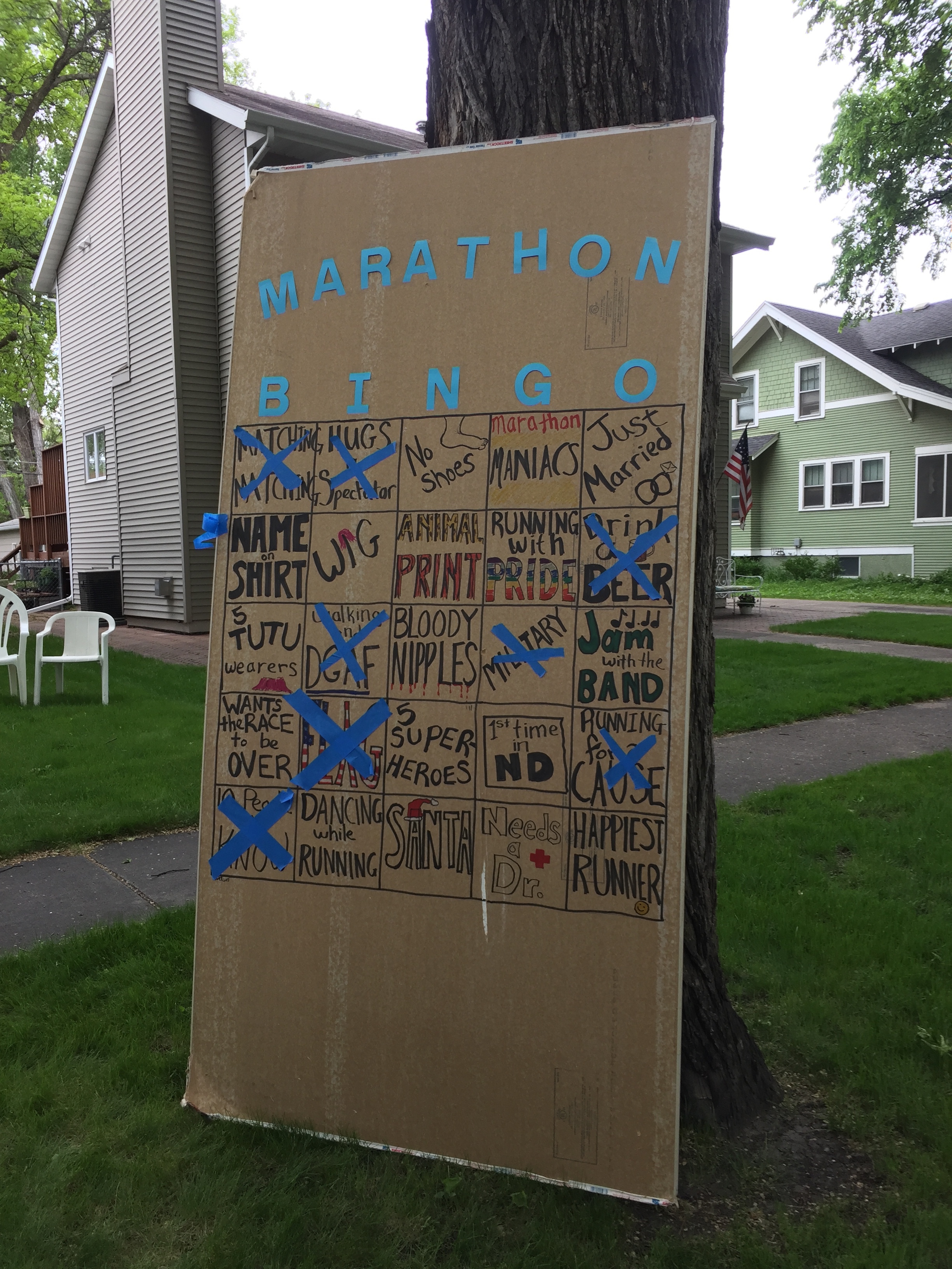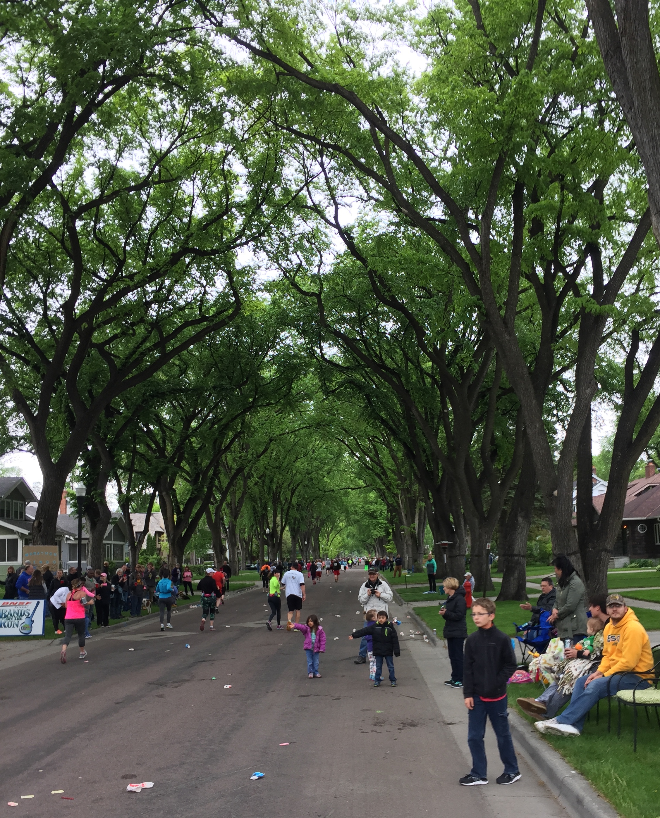 The residents of Fargo were very welcoming. I stopped along the course to take a picture of an elm tree-lined street and started talking to a woman about her beautiful trees and Dutch Elm disease. She ended our conversation by asking me to come back for next year’s race. People living along the course definitely enjoyed the race. They had some of the best signs. Usually I see the same old signs at every race. Not in Fargo. They came up with very unique and creative signs to keep the runners laughing. They put EZ-up tents in their front yards and were handing out water, licorice, and fruit (including peeled oranges). It looked like many of them were treating race day like a big party.
