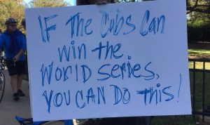 The race started in Grant Park behind the Art Institute on South Michigan Avenue and headed north to Lincoln Park, past the zoo. There were plenty of spectators holding interesting signs and cheering along the way. We ran past a senior citizen assisted-living center where the windows were plastered with motivational signs for the runners. Some of the residents sat by the windows waving at us while others sat in wheelchairs along the road, clapping and waving flags.
