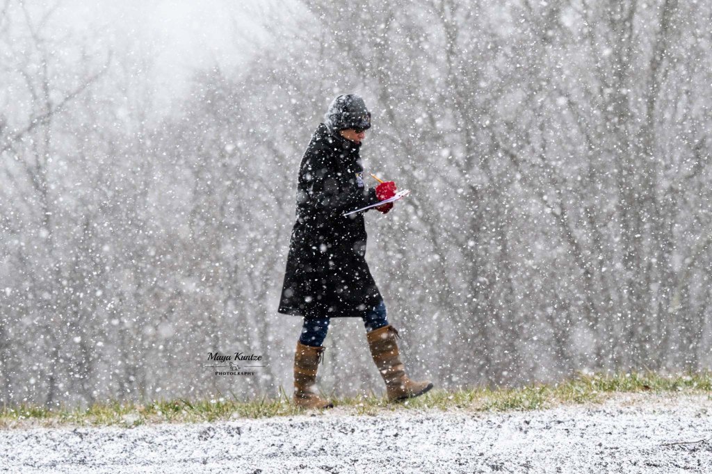 After clearing the ring of the other riders, I started him on his ride. He cleared the jumps easily despite the snow flurries. I cheered him as he crossed the finish line. I later learned he won the division. Had he left before his ride he wouldn’t have had the experience nor would he have earned that blue ribbon. It occurred to me he would have some good stories to tell about the time he rode his horse in the snow and won. It wasn’t a picture perfect day for a horse competition but he shook off the weather and came out on top.