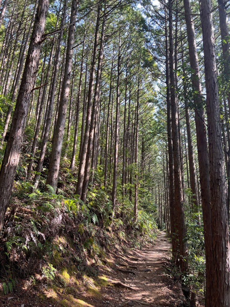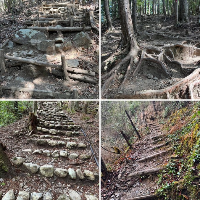 Day 2 was longer, about 12.9km.  Leaving Takahara the trail was initially paved but almost straight up.  At times my heart was pounding and I frequently needed to stop to catch my breath.  There were many other pilgrims who started out at the same time and similarly were taking breaks during that climb. The trail soon became uneven dirt trails through forests like those I had walked on the previous day.  In my brain I heard Waka telling me to walk like a cow.  In Montana I have ridden horses behind many cows ambling along.  I pretended to be one of those cows and found it was easier to keep going.  After passing the remains of a tea house, the trail started downhill.  Easy, right? I quickly discovered the downhill sections were even more challenging than the climbs.  The narrow trail required people to walk single file and carefully tread to avoid tripping on tree roots and rocks.  One misstep and it would be a header into a rock and the end of my pilgrimage.