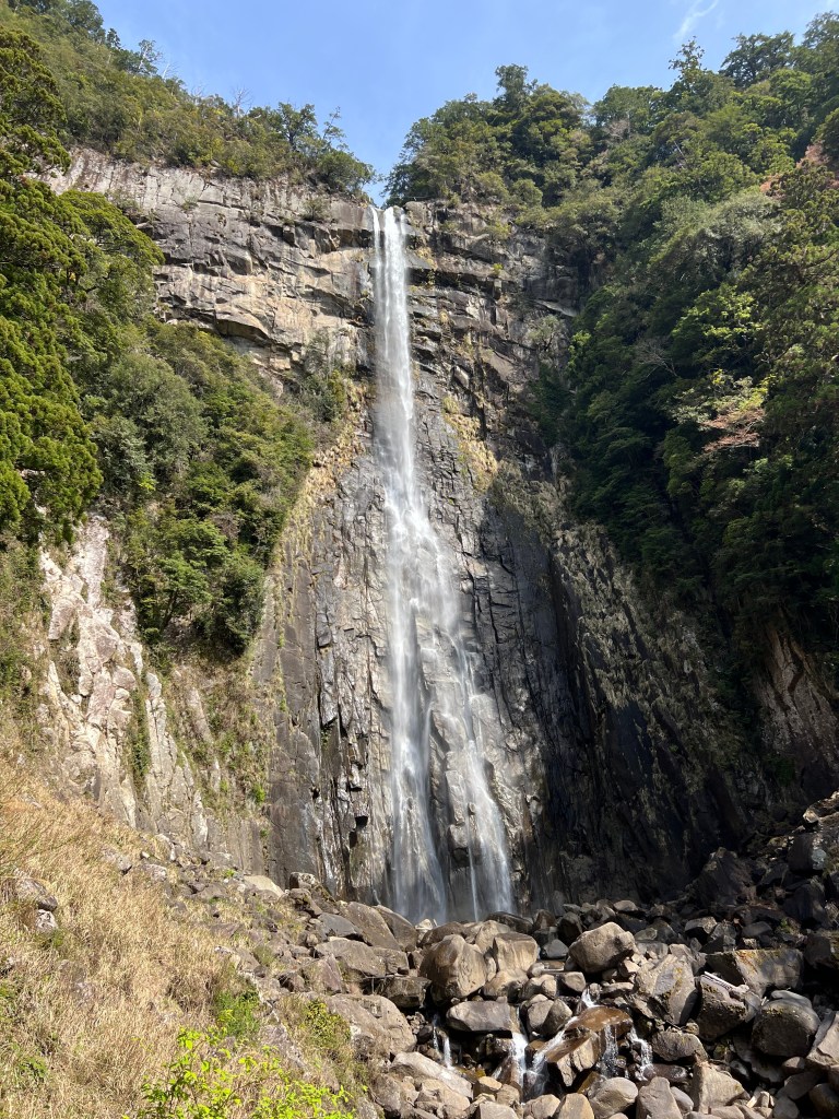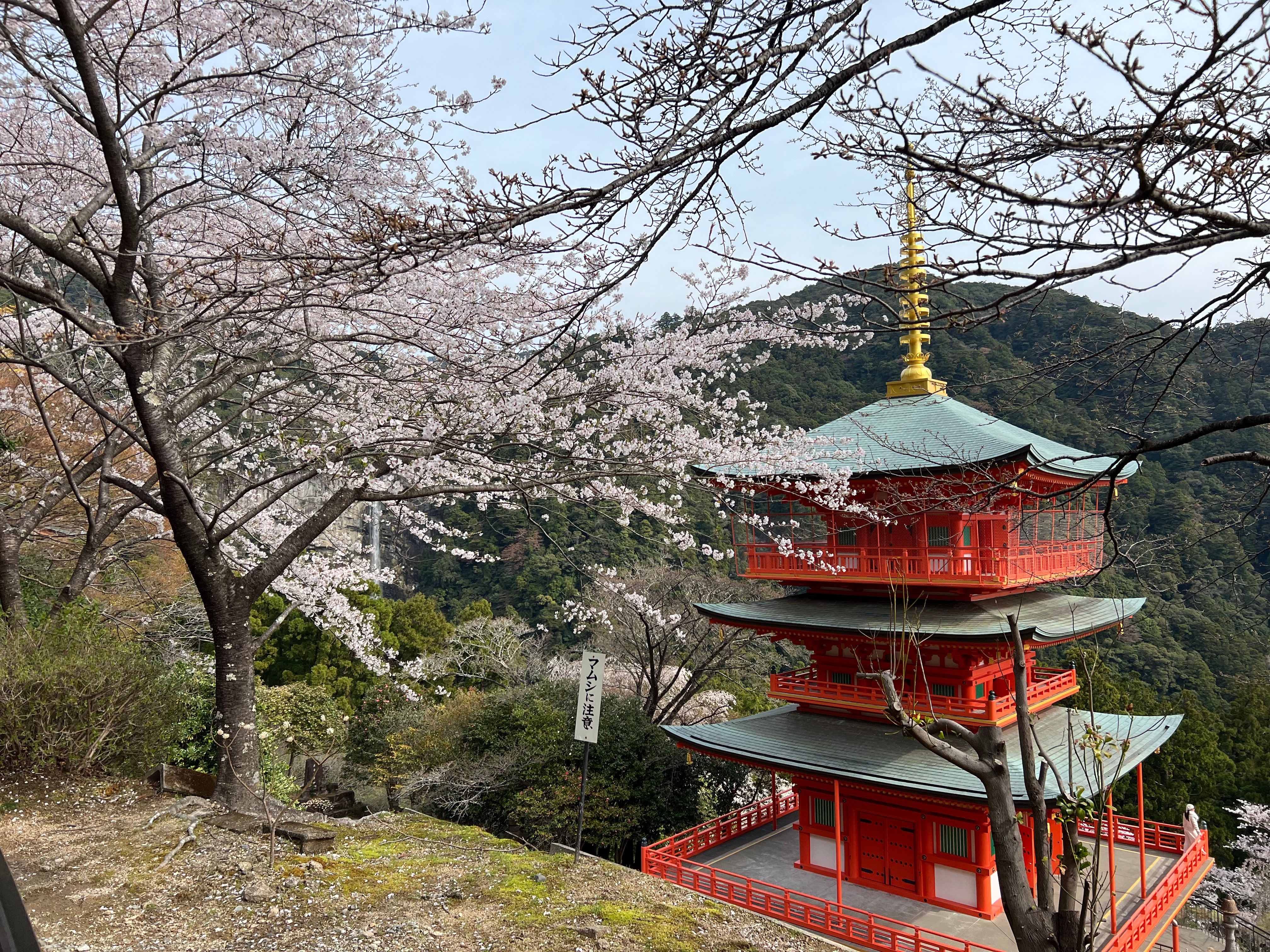 My last day I took a bus to Katsuura to visit Kumano Nachi Taisha, the Three-Storied Pagoda overlooking the Nachi Waterfall (the scene from that old magazine article).  But first I had to climb stairs, lots of them (over 300 though there were even more stairs between all of these shrines). The Nachisan area was full of cherry blossom trees.  The waterfall is the tallest waterfall in Japan and can be seen from far out in the Pacific Ocean.  The spray from the waterfall is believed to have benefits to prolong life.  There is also a pool of longevity water from the waterfall for drinking in case you don’t feel the spray.  Final day stats 17,298 steps and 81 flights climbed.