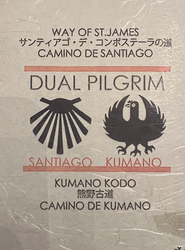 My Dual Pilgrim Certificate with the Scallop representing the Camino de Santiago and the Three-Legged Crow representing the Kumano Kodo. The three legs reflect the three virtues of the main diety: Wisdom, Benevolence, and Valor