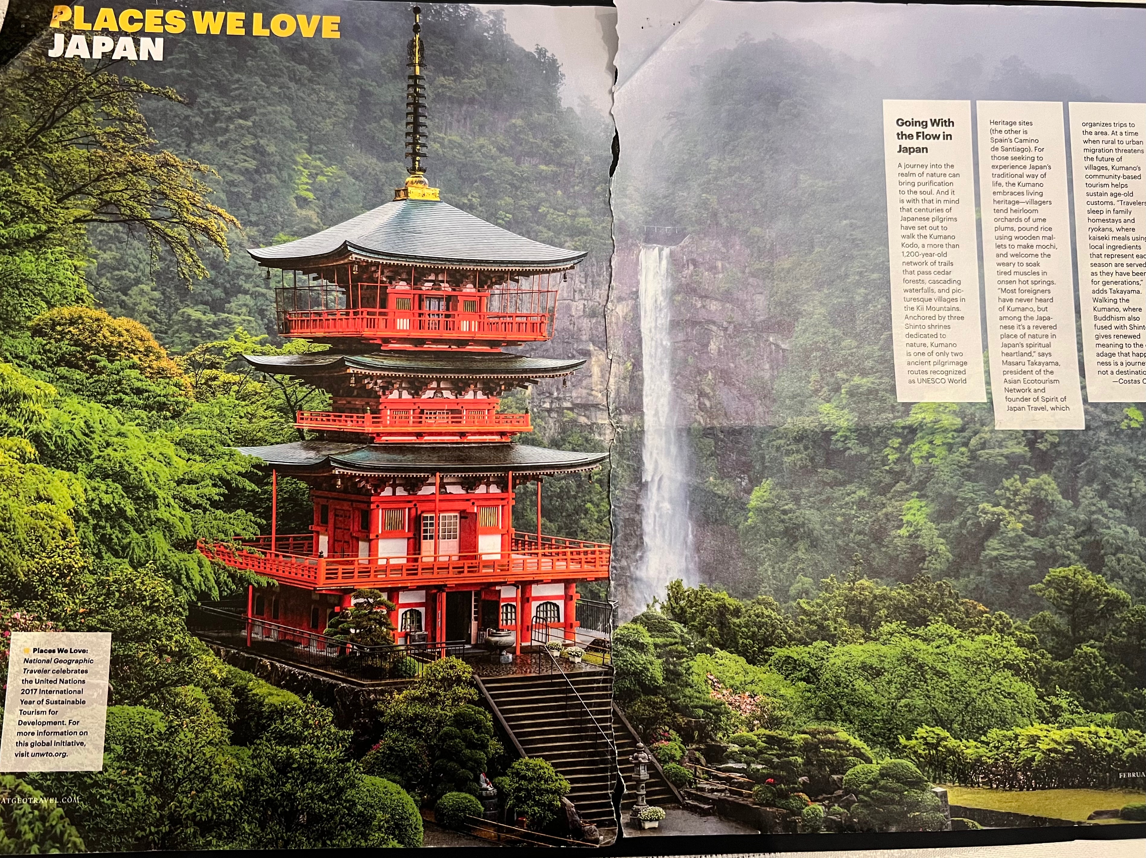 Several years ago I read an article in Travel and Leisure magazine about the Kumano Kodo, a 1,200 year-old network of trails through the Kii Mountains that pass cedar forests, waterfalls, and small villages with hot springs leading to three Shinto shrines dedicated to nature. Kumano Kodo is one of only two ancient pilgrimage routes recognized as UNESCO World Heritage sites (the other being Spain’s Camino de Santiago).  The photo in the article of the Three Storied Pagoda with the Nachi Waterfall behind it was an image that lodged in my brain.  I vowed to myself I would one day visit it.  (I learned about the Camino much later and ended up walking the Camino Portuguese route in 2019.)  While cleaning out some files, I came across that article.  It was then I decided walking Kumano Kodo was the perfect way to honor Jane.